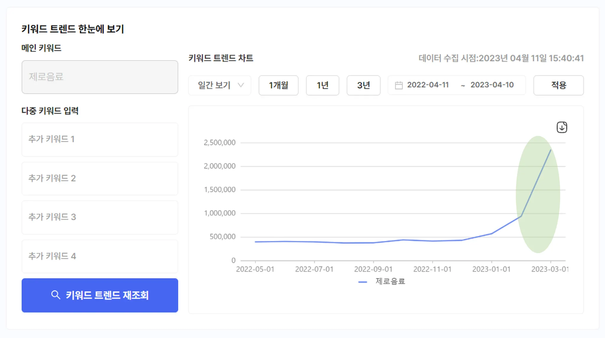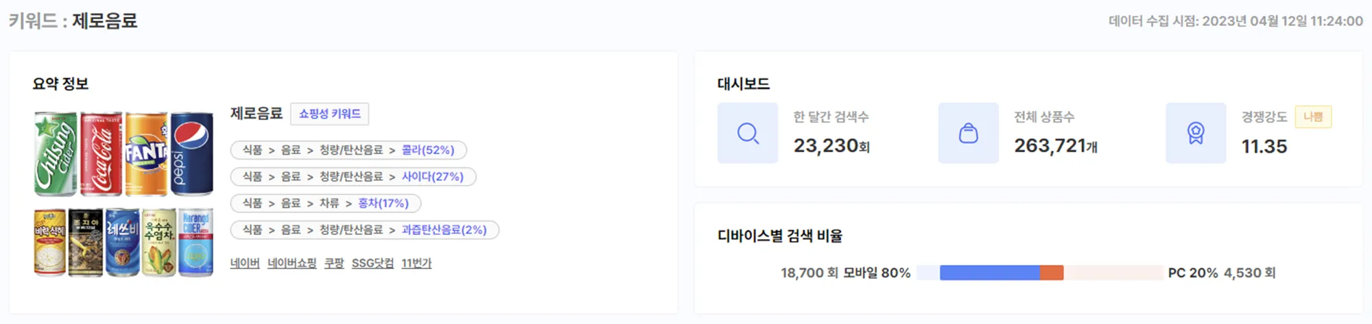 예를 들면, 최근 건강에 대해 관심이 높은 사람들의 니즈를 반영한 제로음료 키워드는 11.26라는 높은 경쟁강도를 보이지만 지속적으로 검색량이 많은 키워드는 아니었어요. (제로콜라는 이전부터 있었지만요.)