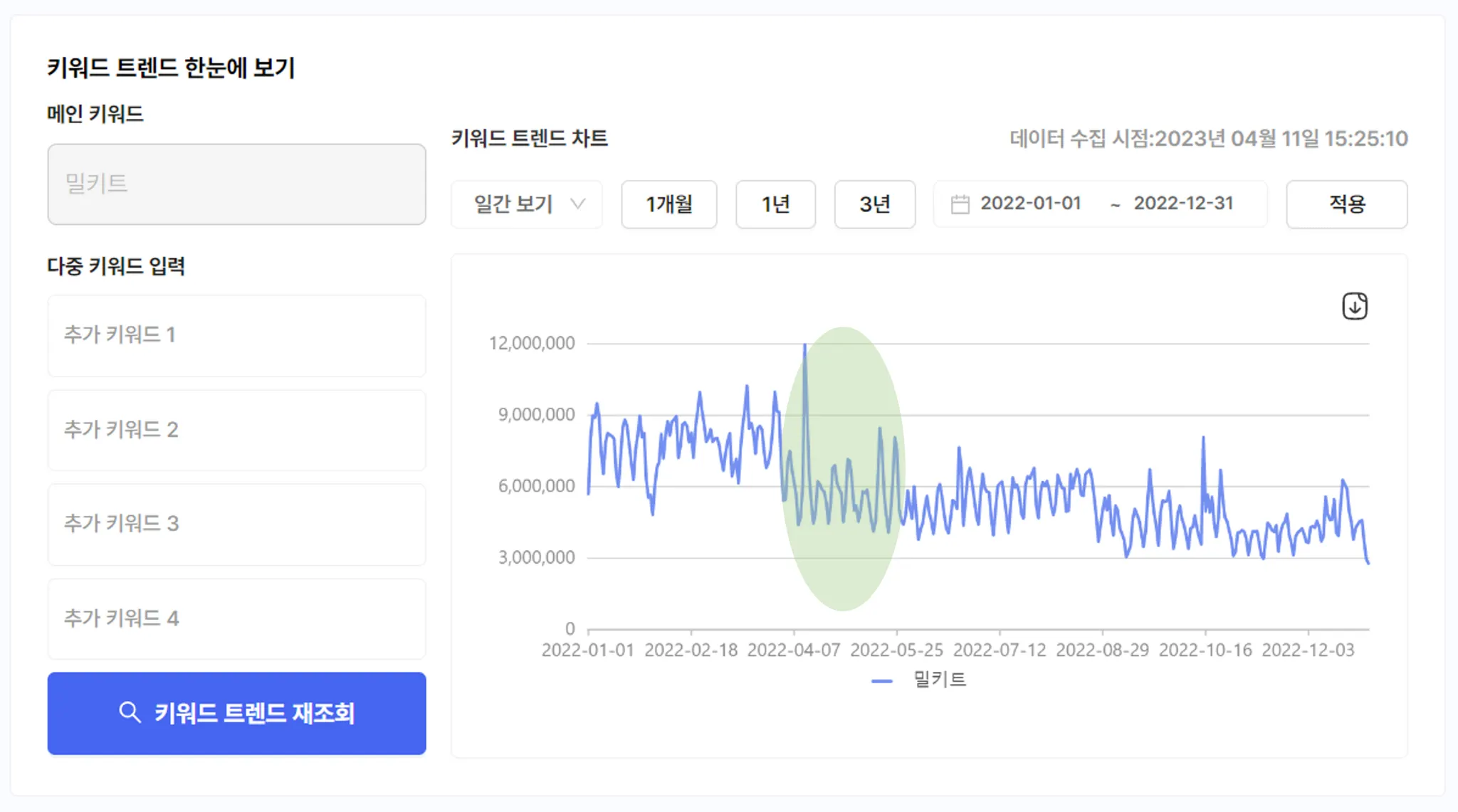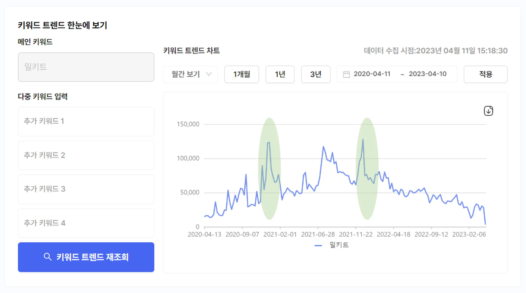 이어서 키워드 분석 페이지에서 이 키워드가 시장성이 있고 성장 가능성이 있는지 확인할 수 있어요.