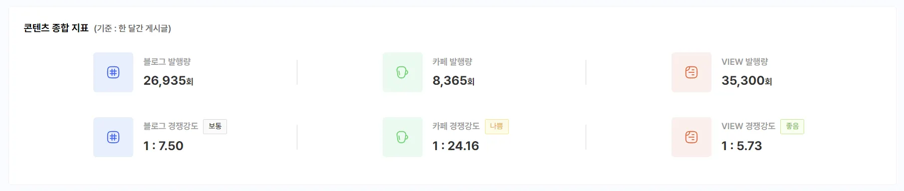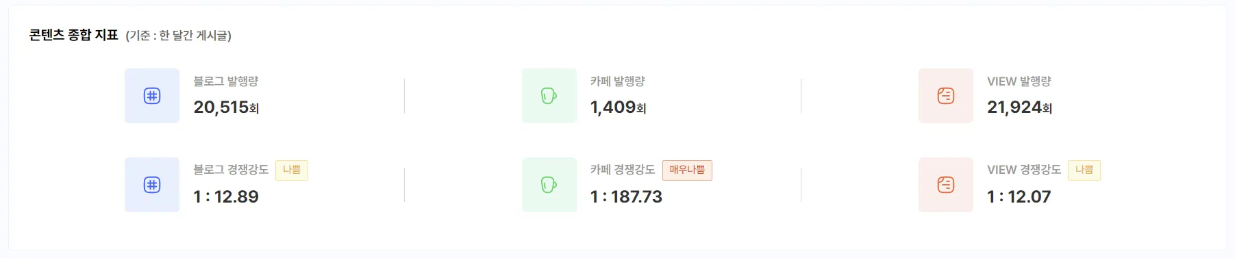 네이버에서 최근 한 달간 발행된 콘텐츠 수와 경쟁강도를 확인할 수 있어요.