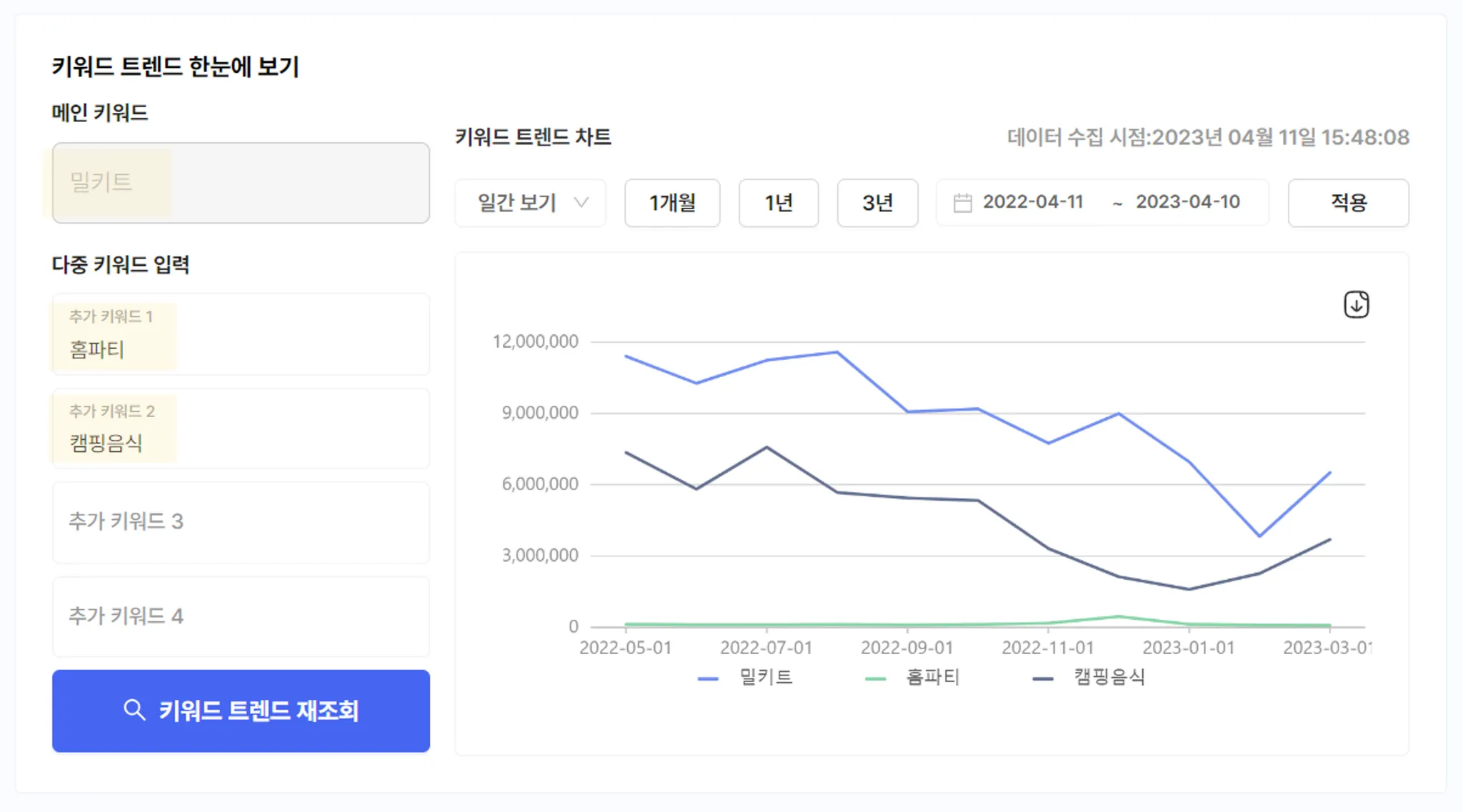 키워드 트렌드 한눈에 보기 기능은 키워드의 1개월, 1년, 3년 단위의 검색량을 제공하고 있어요.