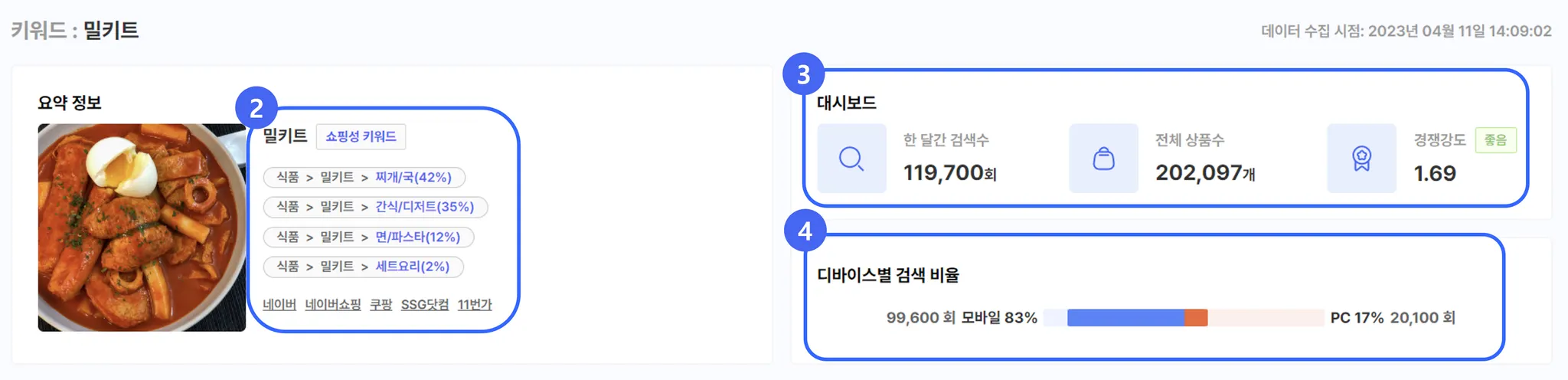 ③ 대시보드에서는 한 달 간 검색수, 전체 상품수, 경쟁강도를 확인할 수 있습니다.