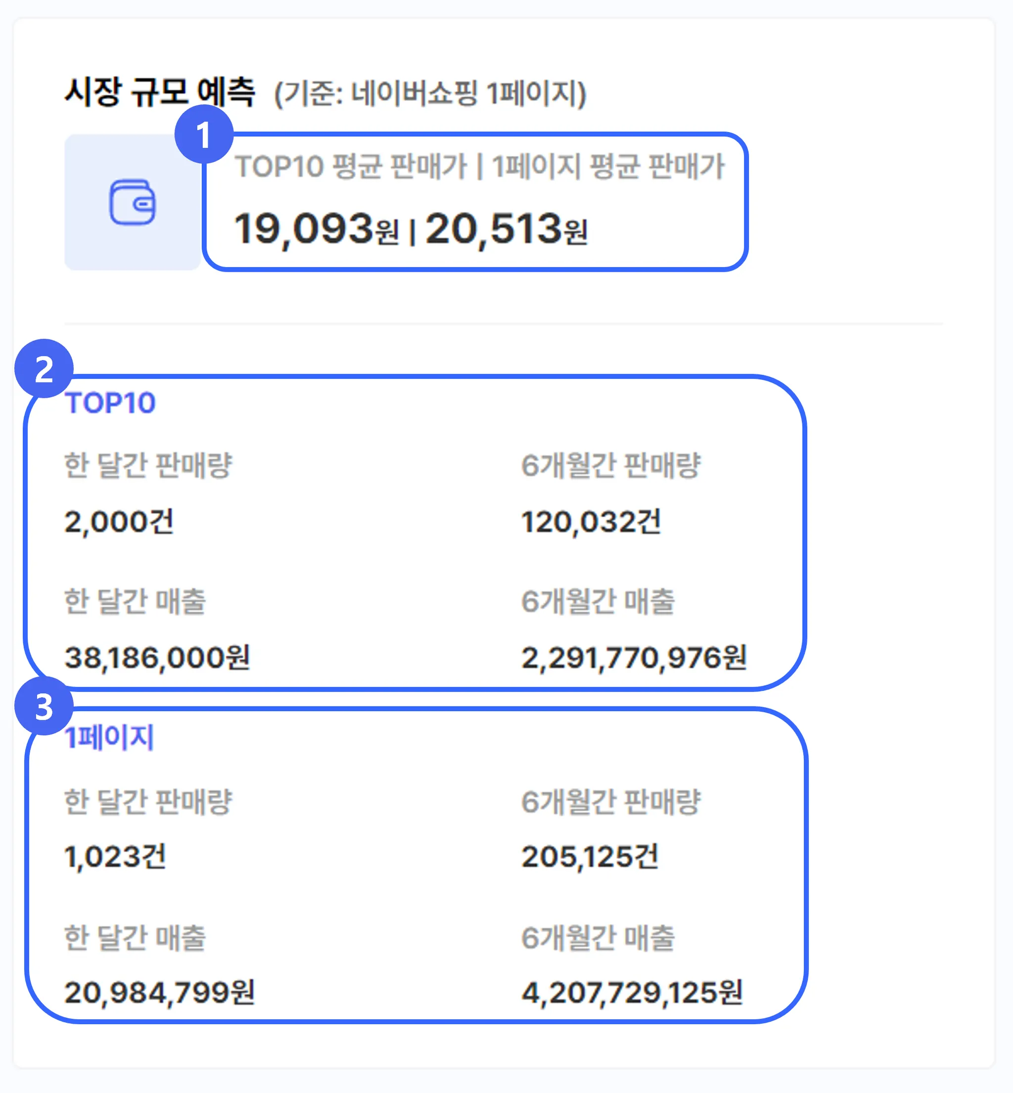 ① 네이버 쇼핑 1페이지의 TOP10 평균 판매가와 1페이지 평균 판매가(TOP40)의 평균 판매가를 확인할 수 있습니다. (데이터 수집 시점에 따라 평균 판매가는 변동됩니다.)
