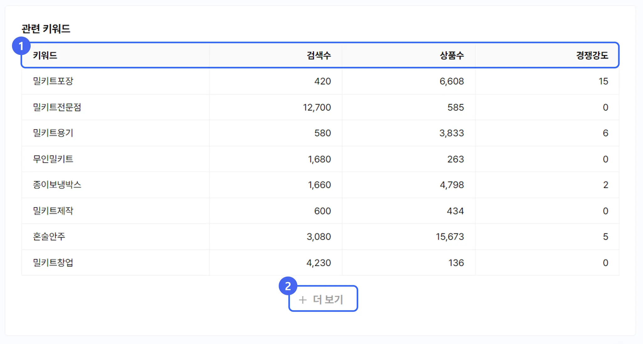 ① 검색한 키워드와 관련이 있는 키워드들의 검색수, 상품수, 경쟁 강도를 확인할 수 있어요.