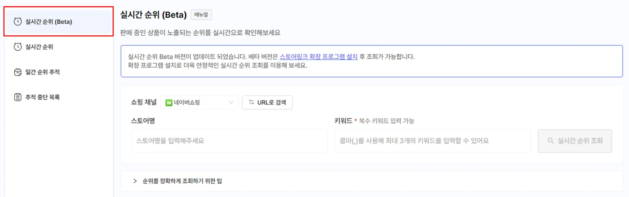순위 추적 기능에 새롭게 실시간 순위(Beta) 버전이 추가되었습니다.