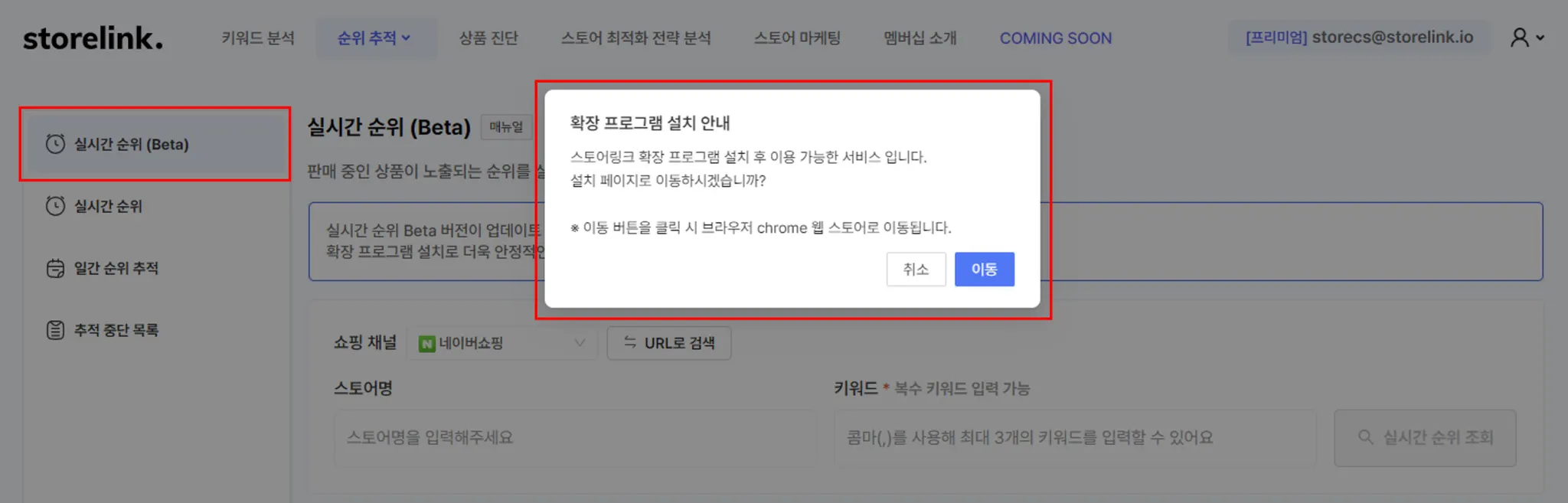 ③ 스토어링크 - 순위 추적 - 실시간 순위(Beta)에서 실시간 순위 조회를 하세요.