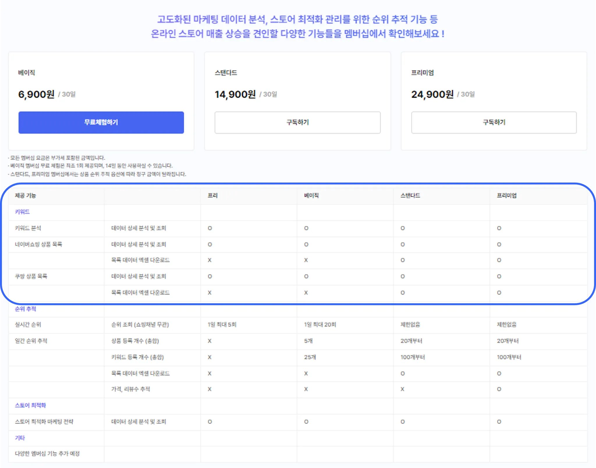 베이직 멤버십은 사용할 수 있는 키워드 분석 기능이 프리 멤버십과 동일합니다.