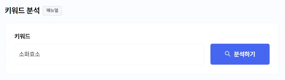 키워드 분석 메뉴에서 판매하고 싶은 상품과 연관된 키워드를 입력해주세요. 예시로 소화효소 키워드를 입력해볼게요.