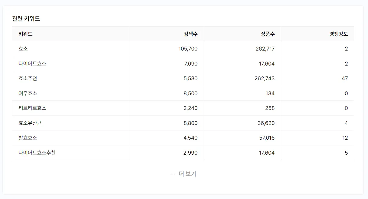 더보기를 누르면 더 많은 키워드를 확인할 수 있어요. 판매할 상품의 상품명, 태그, 상세페이지 텍스트에 관련 키워드를 적절하게 활용해주세요!