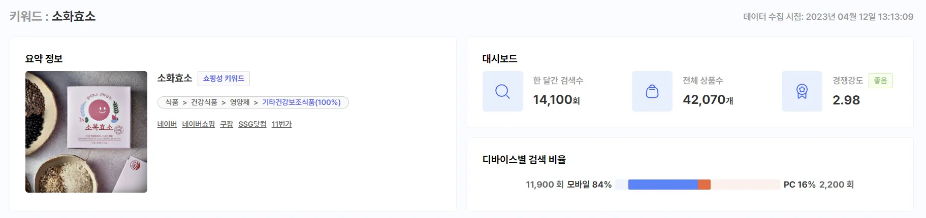그 외에 판매 채널들과 경쟁 강도를 확인하고, 내가 판매할 상품에서 사용하면 좋은 키워드인지 파악해보세요.