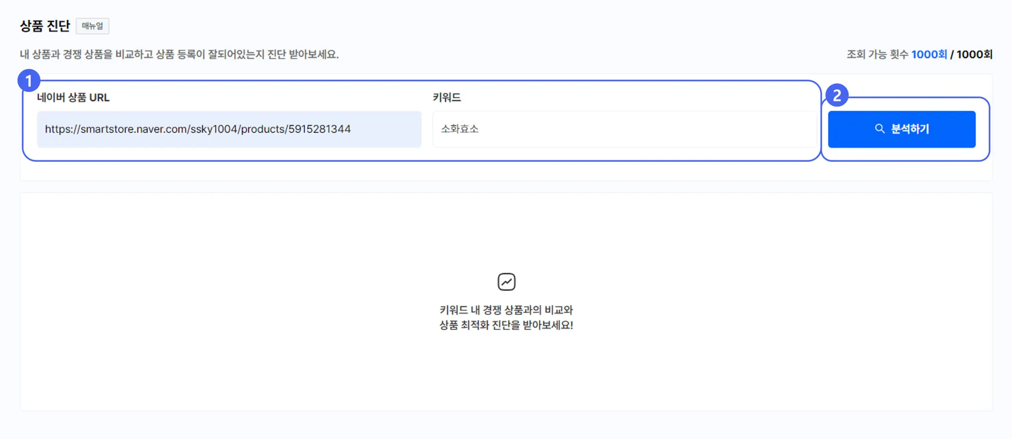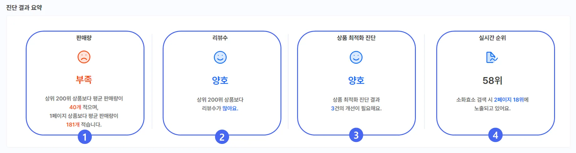 상품이 최적화가 되어 있는지 확인하고 경쟁 상품과 비교하였을 때, 어떤 요소가 부족한지 진단해주는 기능이에요.