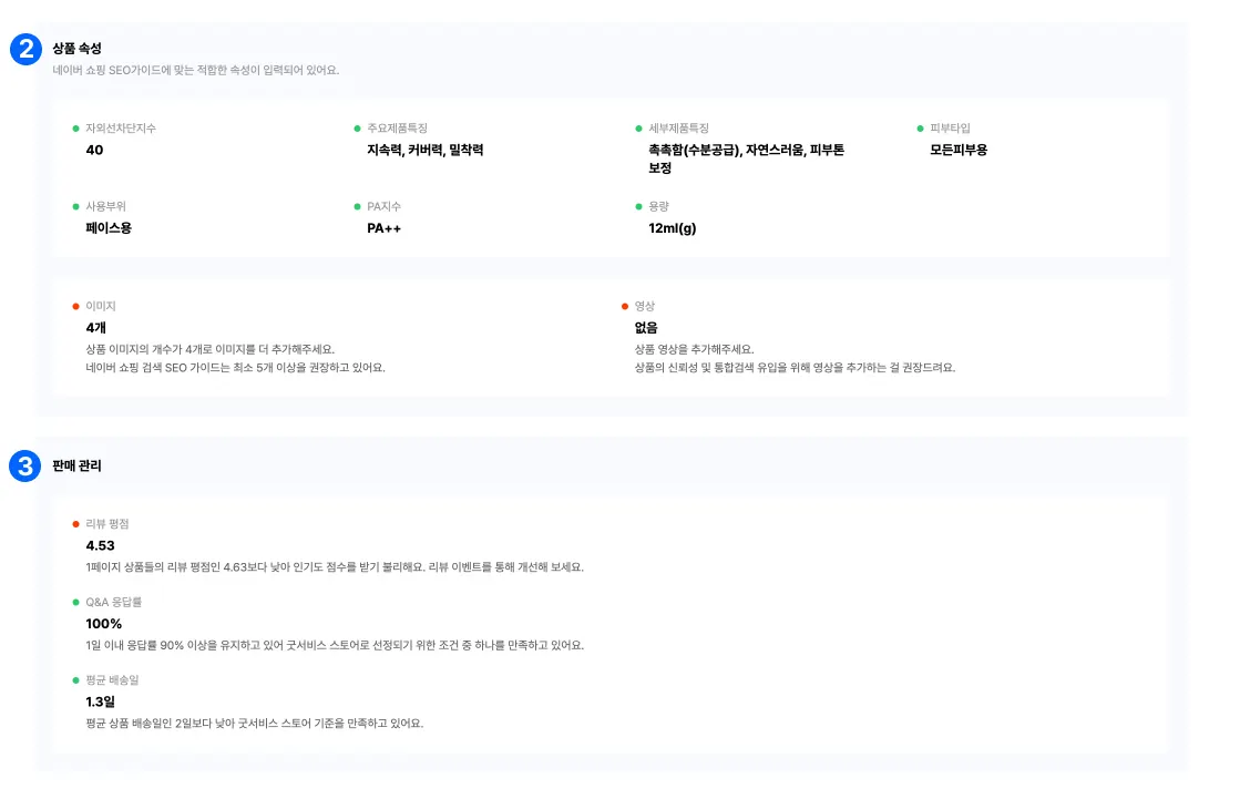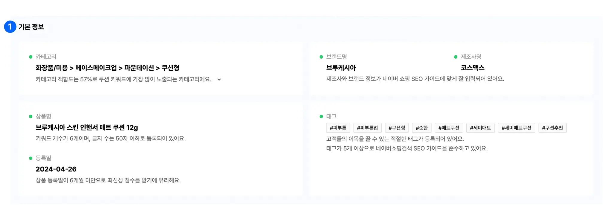 기본 정보, 상품 속성 영역은 네이버 쇼핑 SEO가이드에 맞춰 적합도를 판단하여 정보를 제공합니다.